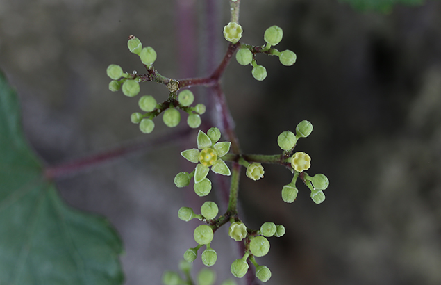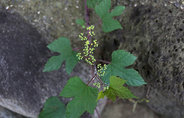 のぶどう(野葡萄)Ampelopsis glandulosa var. heterophylla takashi tanabe / 2015年9月4日 [vol.905/2015年9月4日] ブドウ科/ノブドウ属/つる性落葉低木/開花:7〜8月、結実:10〜12月 日本全国、市街地から野山までよく見られる。花の形はヤブガラシとよく似ている。果実はピンク、白、瑠璃色など色とりどり、秋にはコバルトブリーになり野山を彩る。果実はブドウタマバエやブドウトガリバチの幼虫が寄生して、虫こぶを作ることが多く、正常な果実は少ない。 ▼ indicated big(play slideshow)