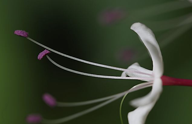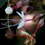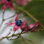 野山で見かける花である。遠くから見るとアジサイのようだが近寄って見ると、深紅色の萼に5弁の白い花が突き出ている。枝や葉には強い悪臭があるが、花は良い香りがする。虫が良く集まる。秋になると萼は美しく5裂して赤く染まり球形の藍色の果実をつける。クサギの美しい藍色の実を煮詰め青い汁で、布を染め上げることが出来る。臭木染めと呼ばれ、薄い藍色に染まる。