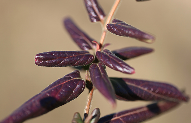 スイカズラは春に特徴有る花を咲かせる。名の由来は花の蜜をこどもたちが吸ったところから吸葛の名前がついたとも言われる。開花前は淡紅色、開くと白くなり、開花の翌日には黄色になるので、金銀花(きんぎんか)、冬でも堪え忍んで葉を付けているという意味で忍冬(にんどう)という名もある。乾燥させた葉はお茶に、花は酒の香りづけに使われる。花の香りは夜に一層濃くなる。夜の虫を引き寄せるためなのか? 写真はエンジ色に紅葉した冬のすいかずらの葉。