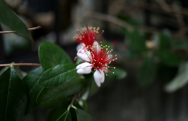 南米原産。日本へは昭和初期にアメリカから渡来。フトモモ科の熱帯果樹としては珍しく-10℃ほどまでの耐寒性がある。紫紅色の「はけ」のようなきれいな花は、外側は白い綿毛でおおわれている。果実は灰綠色ですごく固い。果肉はパイナップルのような香りがあり、そのまま食べたり、ジャムなどに使われる。花言葉: 実りある人生 情熱に燃える心。