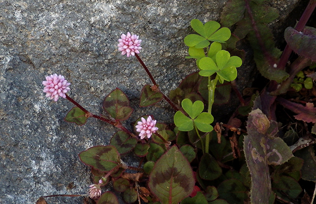 ひめつるそば(姫蔓蕎麦)Persicaria capitata takashi tanabe / 2013年4月7日 [vol.025/2013年4月7日] タデ科/イヌタデ属/多年草/草丈:ほふく性/開花:5月~秋にかけて ヒマラヤ地方原産。明治時代に渡来し雑草化した。開花直後はピンク色をしているが、徐々に色が抜けて白へと変化する。秋には紅葉する。丸いピンクの花の穂が道端や石垣をおおうように咲かせる。丈夫なのでグラウンドカバーとしても用いられる。別名:ポリゴナム。 ▼ indicated big(play slideshow)
