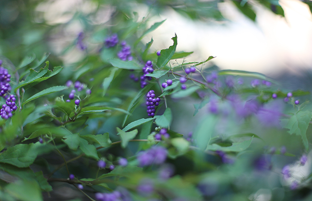 こむらさき(小紫)Callicarpa dichotoma takashi tanabe / 2014年10月3日 [vol.569/2014年10月3日] くまつづら科/むらさきしきぶ属/落葉低木/樹髙:1〜1.5m/6〜8月 山野の林に自生する紫式部と混同されやすいが、通常、家庭の庭で見られものは小紫のことが多い。別名、古式部と言う。花は淡紫色の小花を根元に近い方から順次開花し先端に咲かせていく。それを追うように実をつける。実は、緑色からきれいな紫色に変わる。