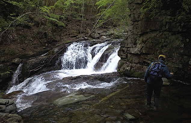 途中峠越えの道は相変わらず道路工事が行われていた。この冬の豪雪の被害は奥多摩方面でも所々で見られる。一之瀬林道にはいても、道路の左斜面に張り巡らされた鉄編みも、ずり落ち、それを支える鉄柱も道路側にひん曲がっているヵ所が何カ所もあった。路上には大小の岩が転がり落ち荒れ果てていた。林道は平日には珍しく、石南花橋までの間に釣り客らしい車が4,5台駐まってる。石南花橋にも20代前半のフライマンが準備を済ませ、丁度沢へ降りて行くところであった。どの沢に入っても先行者がいるのは否めない。準備をすませた時は11時近かった、先行者が、6時頃に入渓下としたら、もう随分先を釣行しているはず??? 我々は、支流に入ることにた。