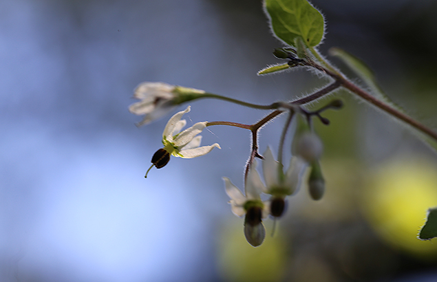 ひよどりじょうご (鵯上戸) Solanum lyratum takashi tanabe / 2015年10月4日 [vol.935/2015年10月4日] ナス科/ナス属/多年草/草丈:50〜100cm/6〜10月 茎や葉には柔らかい毛が密生する。花のつく枝は葉と対生し、ふたまた状に枝分かれする。下部の葉は深い切れ込みがある。葉は変化が大きく分裂しないものから3裂、5裂するものなどがある。花は晩夏に大きく外に反り返った五枚の白または紫色の花弁を持つ。果実は秋に1cm程度の球形の実を付け、赤く熟す。 ▼ indicated big(play slideshow)