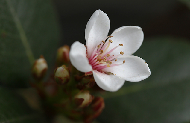 しゃりんばい(車輪梅)Rhaphiolepis umbellata takashi tanabe / 2014年12月18日 [vol.645/2014年12月18日] バラ科/シャリンバイ属/常緑低木〜小高木/花:晩春〜初夏、実:秋〜冬 日本(東北地方南部以南)、韓国、台湾までの海岸近くに分布する。庭木や公園樹として植栽されることも多い。花後に成る果実は、8~9月は黄緑色地の表面に少し紫色がのる程度で、11~12月に黒熟する。鹿児島県の奄美大島では、樹皮と根を煎じたものを大島紬(おおしまつむぎ)の染料として使う。名の由来は、一箇所から多数出る小枝が車軸のように見えること、花が梅に似ていることから付けられた。