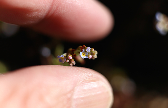 きゅうりくさ(胡瓜草)Trigonotis peduncularis takashi tanabe / 2015年3月4日 [vol.721/2015年3月4日] ムラサキ科/キュウリグサ属/2年草/草丈:20cm前後/開花:3~4月 道端や草地、石垣など身近な所でよく見られる小さな草で、葉をもむとキュウリの匂いがするのでこの名がついた。花はごく小さく、2~3mm。そばを通り過ぎても見落としてしまう。別名:胡瓜菜(きゅうりな)、田平子(たびらこ)とも言うが、春の七草の田平子とは違う花である。 ▼ indicated big(play slideshow)